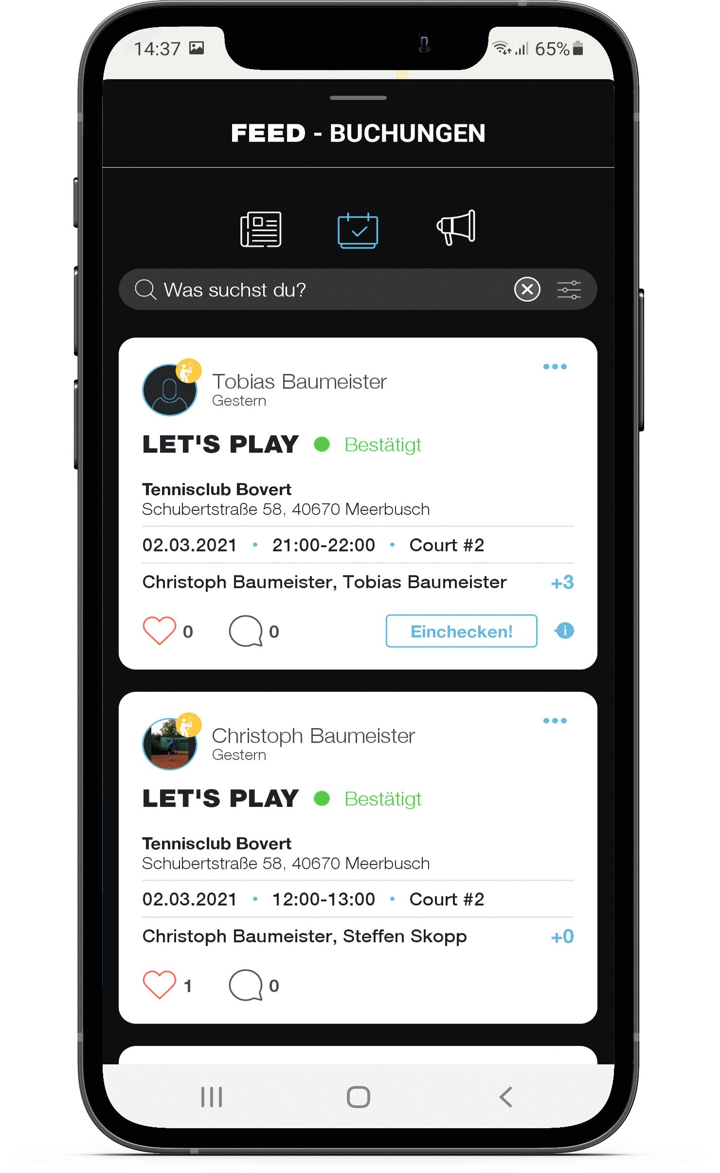 Der Feed ist deine News-Zentrale. Du findest ihn über die Signalwellen in der unteren Menüleiste. Drei Feed-Kategorien stehen zur Auswahl, von links sind das: News aus der playSports-Welt, aus deinem Club und von Freunden, die du kommentieren und liken kannst. Buchungen – die du ändern, absagen und kommentieren kannst. Mitteilungen: Meldungen über neue Follower, Anfragen vom Clubadmin etc. .